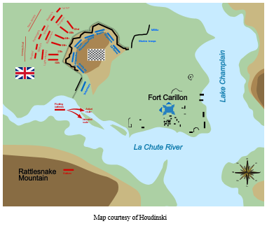 All the advantages, that is, but one: generalship. If Howe exemplified leadership at its best, the opposite must be said of Abercromby. Convinced of faulty intelligence, haste informed his every action. To begin with, he had no need to attack at all. Abercromby had the option of fixing the French on the heights, deploying guns to Rattlesnake Mountain, while sending the rest of his army to cut the road to Fort St. Frédéric, forcing Montcalm to do battle in the open or starve where he was. Thus, the French army might have been bagged en masse, and the war in North America, for all intents and purposes, ended. Once he determined to force the issue, Abercromby had no reason to rush into an attack before a proper reconnaissance had been done. He himself did not lay eyes on the ground until the battle was well underway. At his war council the morning of the battle, during which a general-in-chief typically asked of his subordinate commanders their opinions of certain tactical options, the only input he sought was whether the attack should be made in regimental ranks of three or four.[32]