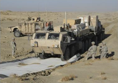 SPC Richard McGee guides the emplacement of a heavy roll-out woven mat during a wadi crossing in Paktika Province, 2011. (Photo courtesy of C. Sinders)