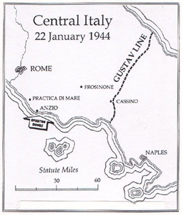 Imagine the situation: In December 1943 Allied forces had taken the lower third of Italy and were stalled almost midway between Naples and Rome. The well-fortified Gustav Line of German Field Marshal Kesselring was holding against continuous murderous assault from Gen. Mark Clark's 5th Army 60 miles south of Rome. In Allied war rooms, pressure was building for an end run that would draw enough German resources away from the Gustav Line to allow a breakthrough. This would enable a link-up of the two forces for the final push on the Eternal City. The principal advocate of this bold strategy was Prime Minister Winston Churchill. General Eisenhower had strong misgivings, but as the newly-appointed Supreme Commander of Allied Expeditionary Forces he was now preoccupied with preparations for OPERATION OVERLORD—the invasion of Normandy. This left British General Sir Henry Wilson in command of the Mediterranean Theater. Wilson did not possess the courage to challenge his headstrong Prime Minister, so despite the doubts of Eisenhower, General Mark Clark and the sacrificial lamb who was put in charge of SHINGLE, U.S. General John P. Lucas, the plan moved into high gear.