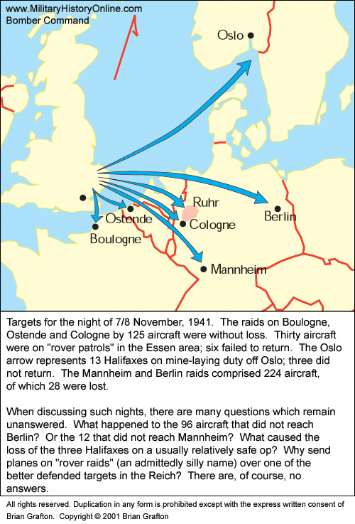 The first thing worth noting is the number of days (25, or 31.5 percent) and nights (19, or 24 percent) when there was no Bomber Command activity at all. Weather, we know, affected bombing. Reading between the lines, it appears that for this summer, cloud and other conditions were a problem: on August 4/5, for example, 38 aircraft dispatched to Essen encountered heavy icing conditions. Throughout the period under examination, there were a number of nights when bomber formations were recalled ; largely, it seems, because of weather conditions. But there were also times when they were recalled for lack of cloud: the aircraft were too exposed in full moonlight. Nevertheless, bombers must fly to wage war ; and for one day in three, and one night in four, no Bomber Command aircraft were in the air.