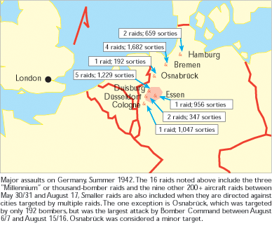 One other intriguing point in tallying the major raids of Summer 1942: in no instance was a city targeted for a major raid on successive nights. Bremen, for instance, was attacked on May 25/26, May 27/28, May 29/30 and June 2/3. What looks like every night at first glance is really every other night. The same pattern applies to the five raids against Duisburg and the two against Hamburg. In addition, in only two instances ; Duisburg on July 25/26, followed by Hamburg on July 26/27; and Hamburg on July 28/29 followed by Saarbrücken on July 29/30 ; were 200+ raids initiated on successive nights.