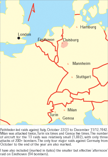 During the same time, there were only three major raids against German targets, against Hamburg (November 9/10), Stuttgart (November 22/23) and Mannheim (December 6/7). A fourth raid, against Duisburg on December 20/21, ended Bomber Command's year. Of the four, only Duisburg was considered a success. The others were plagued by foul weather, and PFF marking suffered accordingly. Greater success was achieved in a daylight raid against Eindhoven on December 6, when 93 light bombers (Venturas, Bostons and Mosquitos) savaged the Phillips factories. The cost to Bomber Command was very high, with losses set at 14 (15 per cent), excluding three aircraft which crashed or force-landed in Britain. [21] The Phillips works were badly damaged, and did not resume full production for six months: the raid was in consequence considered a success.