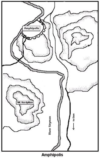 Cleon landed at the seaport fortress of Eion, but a few miles down river from Amphipolis. Thucydides describes his approach to the town as almost casual, as though he expected Amphipolis to fall at the mere sight of his invasion force. Amphipolis, as its name suggests, was bounded on three sides by the Strymon sitting upon a hill. Rising up south of the town was the hill of Kerdyllium; east of Amphipolis and facing its walls stood another unnamed hill. Brasidas knew his adversary would claim at least one of these, occupying high ground. He clearly knew the advantages of each and would offer only one to the Athenians. Brasidas chose Kerdyllium, establishing a conspicuous and chaotic camp on its summit and slopes. Cleon marched his forces onto the eastern hill, expecting the Spartan to either surrender or fight—he did neither. Brasidas evacuated Kerdyllium, retiring into Amphipolis, leaving the Athenians to exhaust their supplies and patience. Through negligence or incompetence Cleon had been maneuvered easily into a tenuous position. Marching to the eastern hill he had presented his well defended shield side of his infantry to the enemy, but now, if he wished to retire to Eion, he would do so with shields facing away from any attackers. This must not have seemed an unmanageable problem, if he could form up into normal phalanx rank and file when Brasidas launched a detected attack. But it seemed that the Athenians, through lack of discipline, unbridled haste and poor battlefield leadership, descended the eastern hill onto the road to Eion, not in phalanx order, but in three separate contingents spread out in marching order.