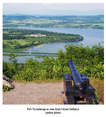That morning, the French heard gunfire from Mount Rattlesnake. This was William Johnson and his 400 natives. They were much too far out of range to pose any menace, and, Montcalm recorded in his journal, “They made a great fusillade that failed to interrupt the work, and we amused ourselves not to reply.”[22] Later in the day, the British launched 20 bateaux to bring cannon to the mountain, but the lead boat got misoriented and bypassed the landing site, and the little flotilla drifted by the fort, drawing a cannonade. The boats frantically reversed course, but two were hit and sunk.[23] This potentially decisive terrain would see no more activity. Its potential would be demonstrated 19 years later, during the American Revolution, when the British besieged rebel defenders at a new fort built at the Carillon site, Fort Ticonderoga. The English hauled guns onto the mountain, renamed Mount Defiance, and the defenders surrendered without firing a shot.[24]