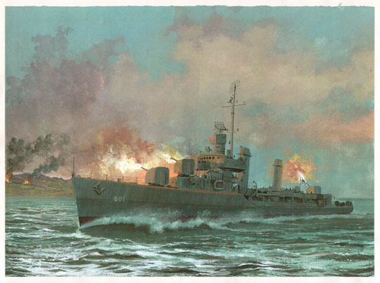 One of the more heroic destroyer actions of SHINGLE was staged by the U.S.S. MAYO, under the command of Commander A.D. Kaplan. It was assigned the hazardous task of coming in close ashore to impede the reinforcing of Nazi infantry units. MAYO and other ships of DESRON 7 shelled enemy forces attempting to cross the Mussolini Canal for more than 17 hours. Out of ammunition and on her way back to Naples, a mine blew open a large hole in her starboard side, flooding the after fire and engine rooms and damaging her propeller shaft. A British tug took her under tow for temporary repairs in Naples. But the enemy hadn't seen the last of "The Merry Mayo", as she was known to her crew. She escorted five more convoys to Europe and even took part in the Okinawa operation.