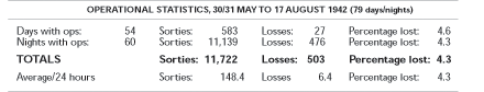 The first thing worth noting is the number of days (25, or 31.5 percent) and nights (19, or 24 percent) when there was no Bomber Command activity at all. Weather, we know, affected bombing. Reading between the lines, it appears that for this summer, cloud and other conditions were a problem: on August 4/5, for example, 38 aircraft dispatched to Essen encountered heavy icing conditions. Throughout the period under examination, there were a number of nights when bomber formations were recalled ; largely, it seems, because of weather conditions. But there were also times when they were recalled for lack of cloud: the aircraft were too exposed in full moonlight. Nevertheless, bombers must fly to wage war ; and for one day in three, and one night in four, no Bomber Command aircraft were in the air.