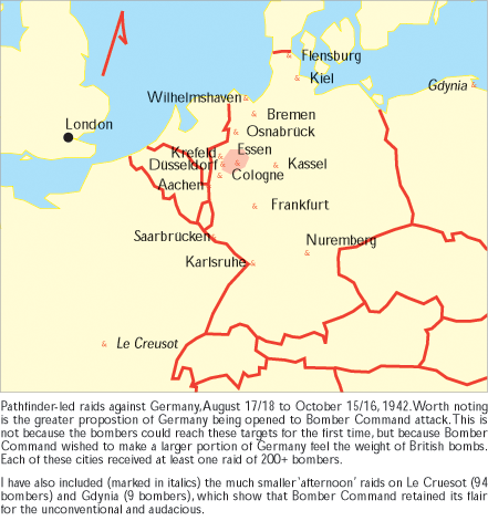 PFF did not become a major force in 1942: its contribution came in the years to follow. But its creation in 1942, even in an imperfect form, was one more step in building Bomber Command into an effective strategic arm. The necessary aircraft ; Lancs, Hallys, Stirlings and Mozzies ; were now available. Lack of personnel was becoming only a minor irritant: CATP crews were beginning to pour into Britain. [12] Streaming techniques had proven effective, and would be refined as the war intensified. Bomb mixes and sequences had been tested, and only needed adjustments based on the target. Target-marking devices had been experimented with, and showed promise. Only 'Gee' had failed to live up to expectations. The final piece of the puzzle ; target finding ; would be addressed by the crews of Pathfinder Force.